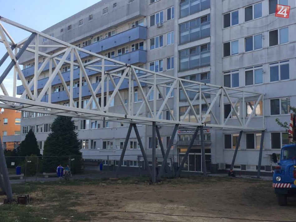 Galéria FOTO: Prepojenie nemocničných pavilónov rastie, postavená je kovová konštrukcia