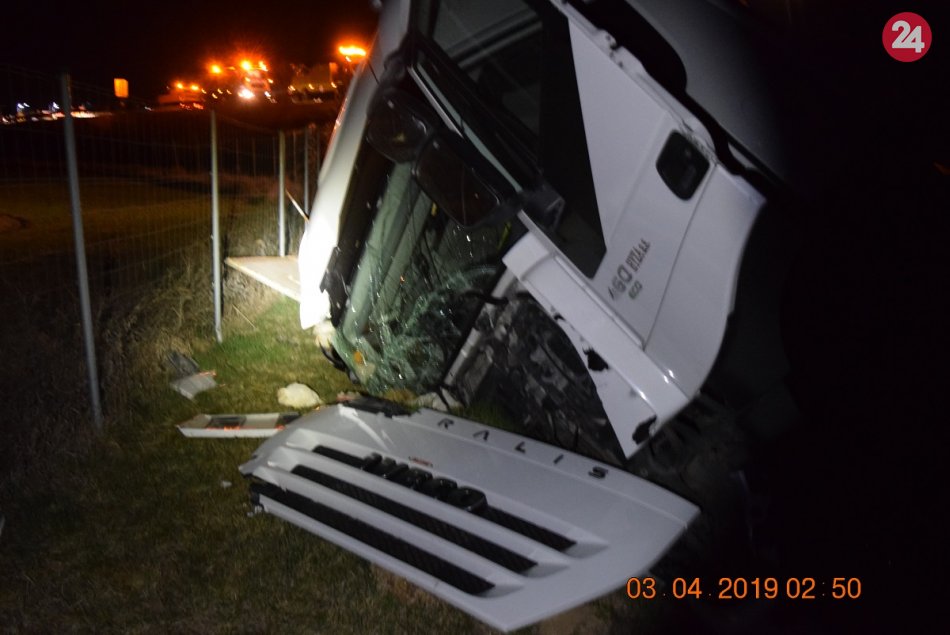 Galéria k článku Hrozivá nehoda na R1: Kamión naložený hydinou zišiel z cesty a prevrátil sa, FOTO