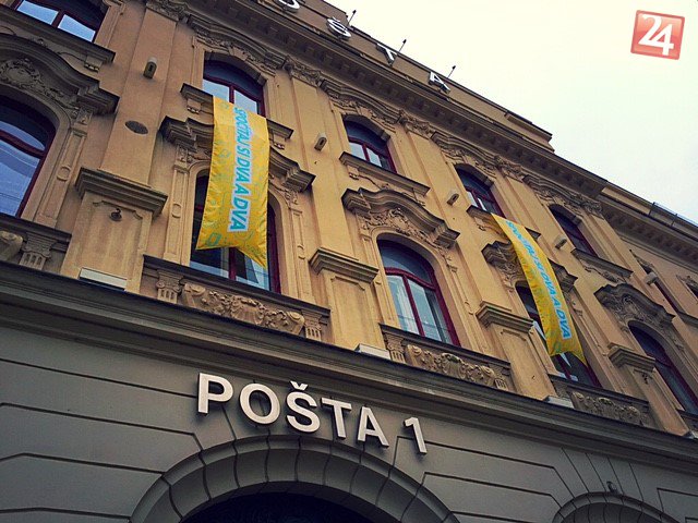 Bratislavská Hlavná pošta ozdobená heslami operátora.