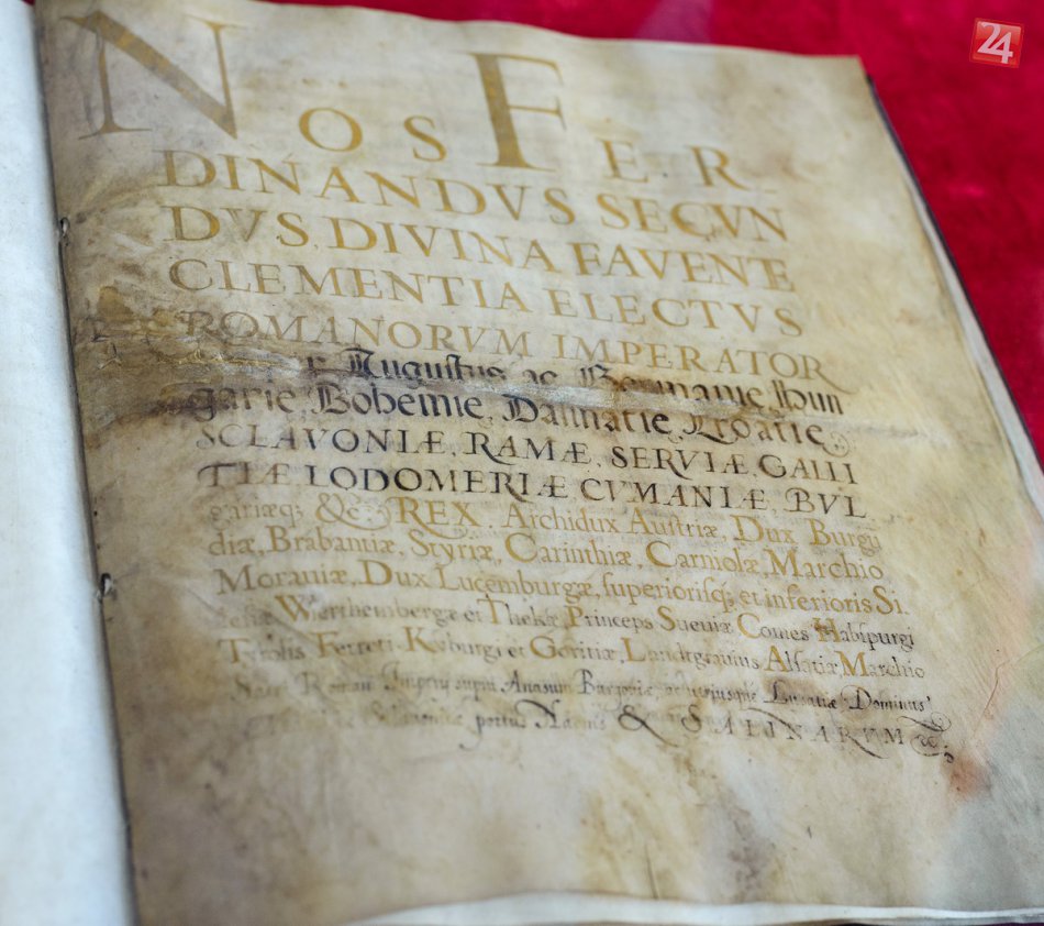 Na snímke slávnostný pergamen z roku 1632, ktorým uhorský kráľ Ferdinand II. potvrdzuje privilégiá, ktoré nitrianskym mešťanom udelil jeho predchodcaexponáty
