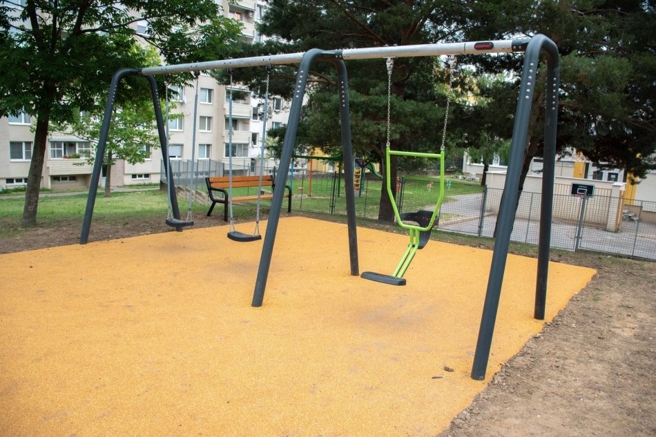 Galéria k článku Pieskovisko v tieni aj ŠPECIÁLNA hojdačka: Na Klokočine vzniklo nové ihrisko
