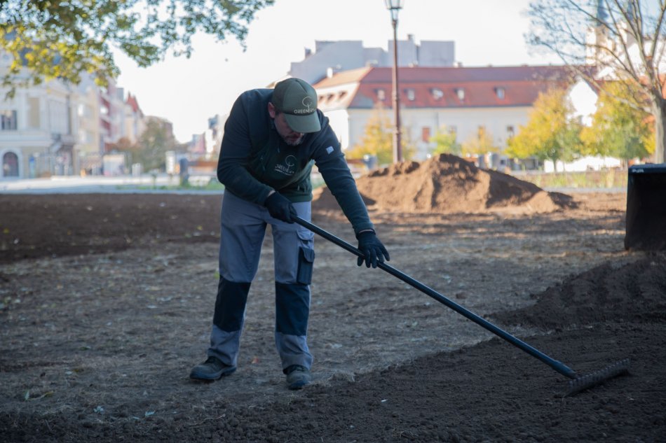 Galéria k článku Parčík pri divadle zrovnali: Vyrastú tam kvety, trávnik aj nové stromy