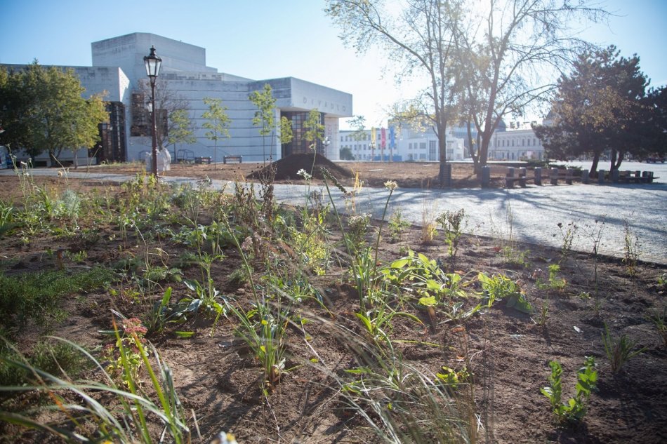 Galéria k článku Parčík pri divadle zrovnali: Vyrastú tam kvety, trávnik aj nové stromy