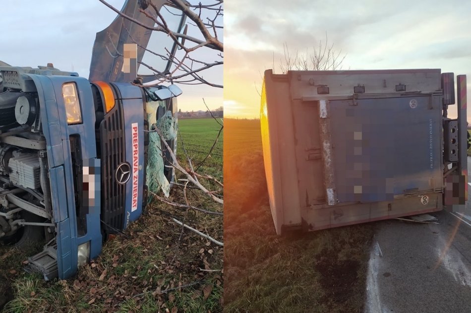 Galéria k článku Dopravná nehoda neďaleko Nitry: Prevrátil sa kamión prevážajúci ošípané, FOTO