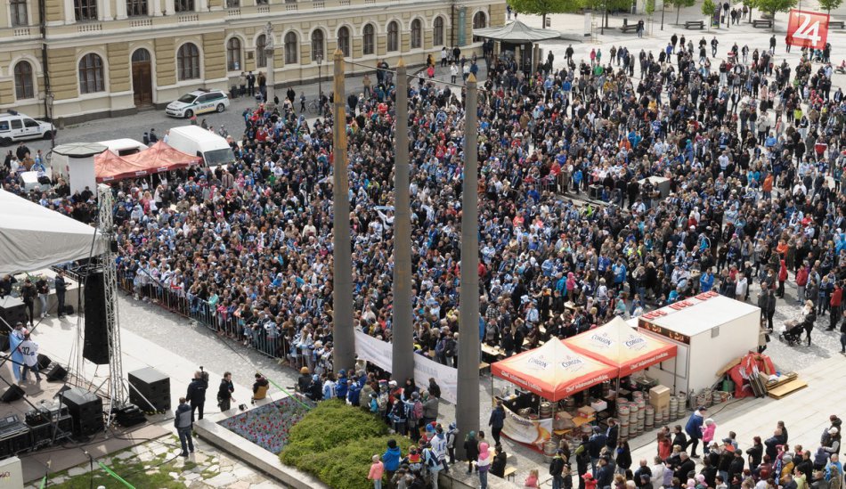 Hokejisti HK Nitra oslávili zisk prvého majstrovského titulu so svojimi fanúšikmi na Svätoplukovom námestí v Nitre v nedeľu 24. apríla 2016