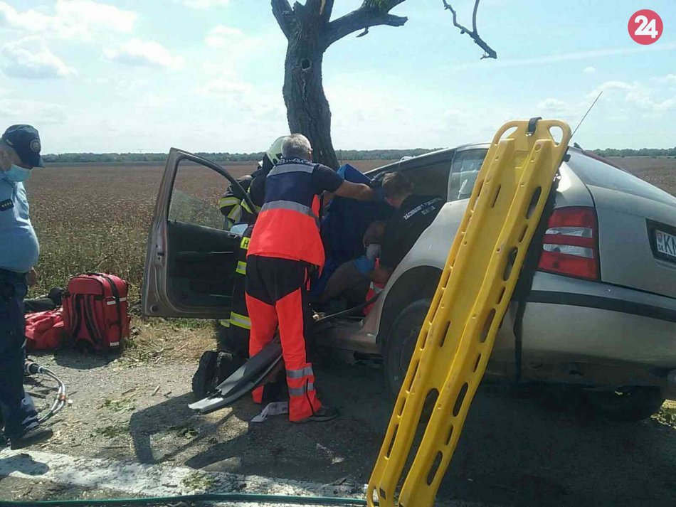 Galéria k článku Auto vrazilo do stromu a začalo horieť: Zraneného vodiča previezol vrtuľník, FOTO
