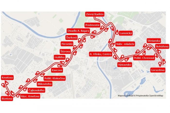 ZIMNÝ ŠTADIÓN – Predmostie – Divadlo Andreja Bagara – Ďurková – Párovská – Hollého – Kavcova – Poliklinika Klokočina – Mikovíniho – Čajkovského – Bizetova – KMEŤOVA.