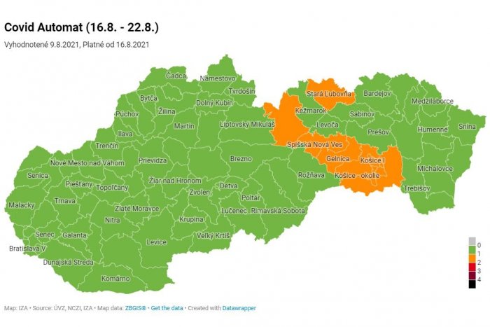 Od pondelka (16. 8.) budú podľa COVID automatu všetky okresy okrem deviatich v zelenej farbe, teda v stupni monitoringu.