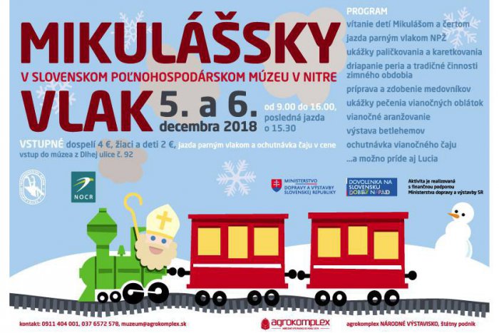 Aj tento rok sa parný vláčik Nitrianskej poľnej železnice premení na Mikulášsky vlak. Podujatie, počas ktorého si deti i dospelí užijú jazdu s Mikulášom a čertom, sa bude konať 5. a 6. decembra v Slovenskom poľnohospodárskom múzeu v Nitre.