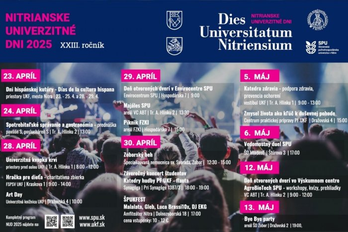 Kompletný program aj s odbornými prednáškami či workshopmi nájdete na webe SPU v Nitre. Tá zorganizovala aj Deň otvorených dverí v Envirocentre, kde záujemcom 29. 4. 2025 predstavia fyzikálny model koryta vodného toku, hydraulické žľaby, zelenú vegetačnú strechu, meteorologické stanice a ďalšie zaujímavosti.