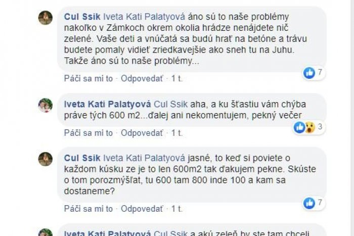 „Máte vy ale problémy…,“ píše pod príspevkom na Facebooku Ivana. „Áno sú to naše problémy nakoľko v Zámkoch okrem okolia hrádze nenájdete nič zelené. Vaše deti a vnúčatá sa budú hrať na betóne a trávu budete pomaly vidieť zriedkavejšie ako sneh tu na juhu,“ oponuje jej ďalší z komentujúcich.