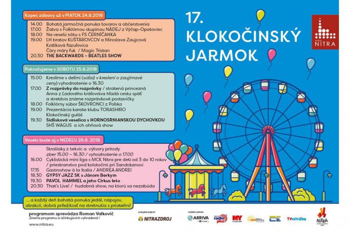 Posledné dni letných prázdnin vyvrcholia v Nitre tradičným Klokočinským jarmokom. Obľúbené podujatie napíše toto leto už svoj 17. ročník. Tešiť sa môžete na tri dni plné programu.